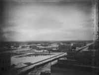 1959 View of early Twin Falls townsite showing streets and new construction; likely taken from atop the Hotel Perrine. Visible signs are Young's Grocery and Seed House (bottom left) and Burrington Hotel (middle right).