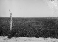 1965 View of a field beyond a wire fence.