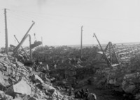 1945 A wide view of early Twin Falls townsite, looking west. The Hotel Perrine is in the middle background. Piles of lumber and a construction crew in the foreground.