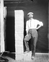 1828 Clarence Bisbee stands beside glass-plate negative boxes.