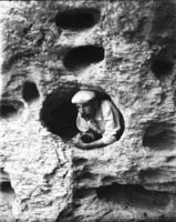 1823 Clarence Bisbee looking through a hole in a rock canyon wall.