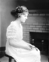 1719 Portrait of a young woman standing next to a fireplace in the Bisbee Studio.