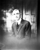 1728 Two portraits of Clarence and Jessie Bisbee posing in the Bisbee Studio. Jessie is deated in a rocking chair beneath a window; Clarence is seated on the floor with rolled carpet.