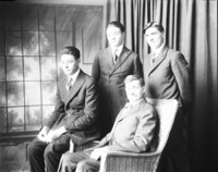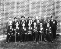 1715 A portrait of fourteen older men wearing ribbons. They are standing and seated in front of a brick building, most likely the American Legion building.