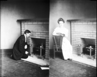 1727 Two portraits of Clarence and Jessie Bisbee posing at fireplace in Bisbee Studio. Clarence kneels, while Jessie is seated.
