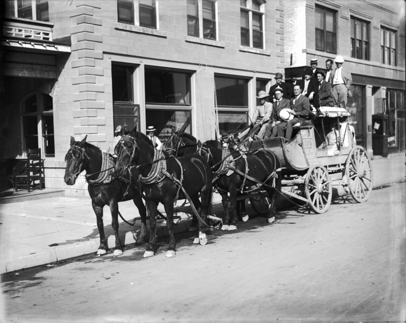 - A stagecoach loaded with men in front of the Perrine Hotel A woman is seated inside.