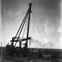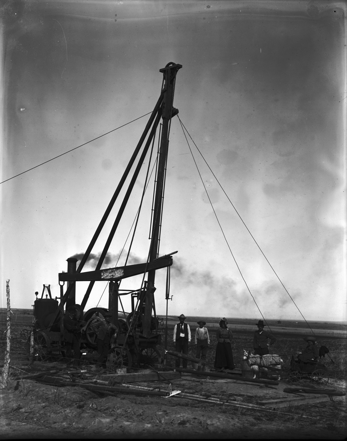 - Five men, a woman, and a girl seated in a cart pulled by a goat standing near a drilling rig at the first well in Twin Falls County, credited to P. B. Johnson.