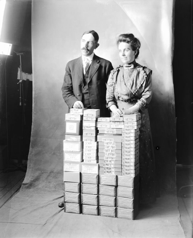 - Clarence E. and Jessie Bisbee standing before stacks of boxes of glass photo plates in their studio.