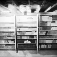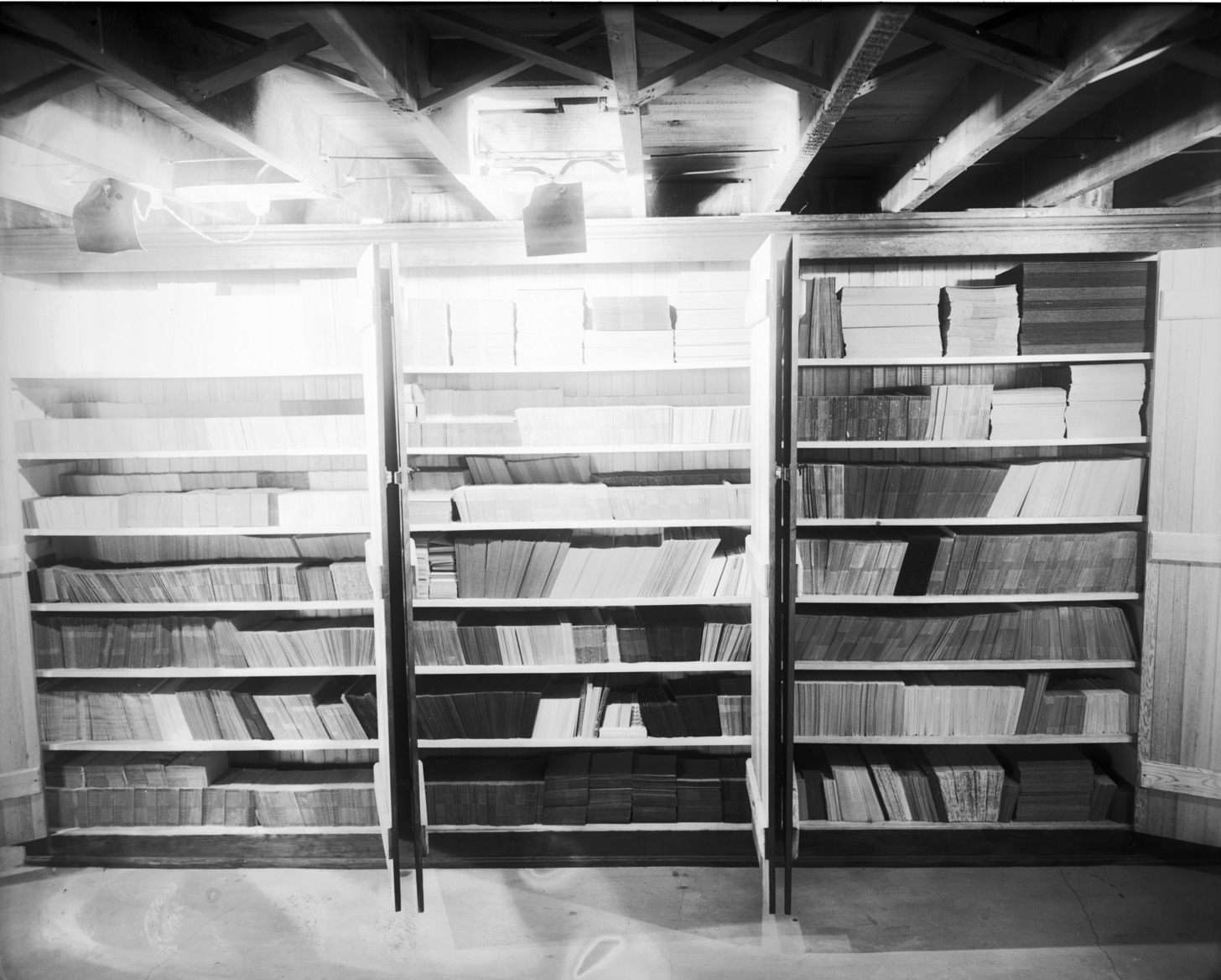 - A wall of shelves holding files of negatives in the Bisbee Studio.