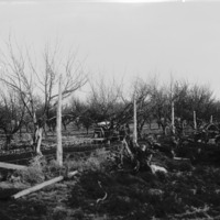 - Orchard with fence and a tractor.