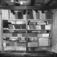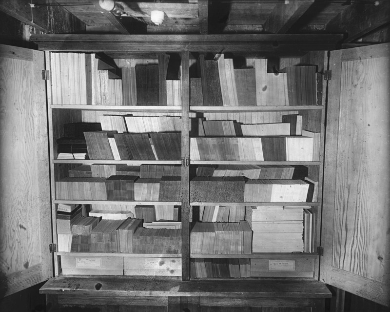 - Shelves of cardboard photograph sleeves at the Bisbee Studio.
