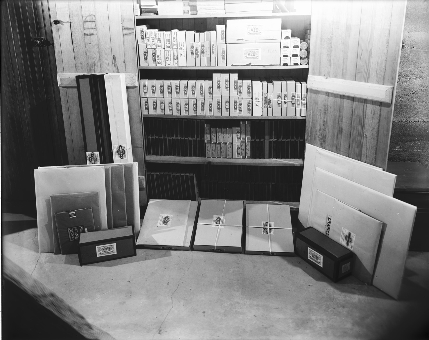 - Shelves of glass plate negatives at the Bisbee Studio.