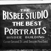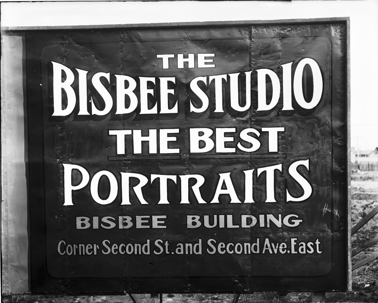- A Bisbee Studio advertisement on a signboard. It reads, "The Bisbee Studio; the Best Portraits, Bisbee Building; Corner Second St and Second Ave East."