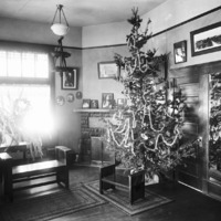 - Interior of the Bisbee Studio; main room decorated with Christmas tree.