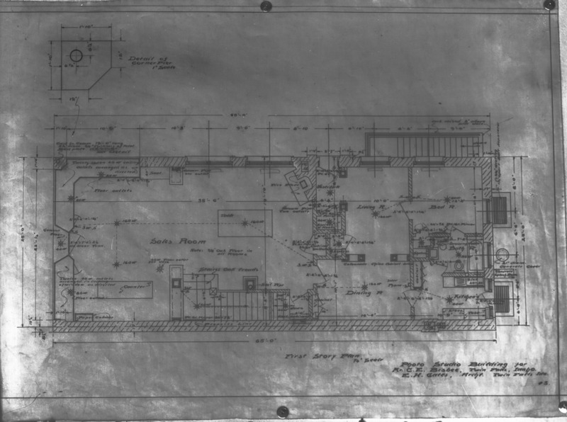 - Blueprints for the first floor of the Bisbee Studio. Plans drafted by Twin Falls architect Ernest Gates.