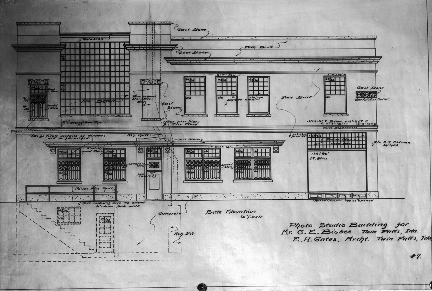 - Blueprints for the side elevation for potential two-story Bisbee Studio. Plans drafted by Twin Falls architect Ernest Gates.