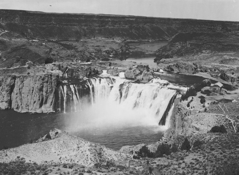 - Wide view of Shoshone Falls, Hotel on right.