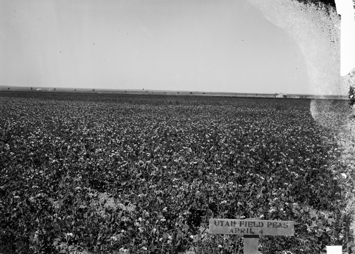 - Field of Utah peas, planted April 4, with a few, scattered buildings in the distance.