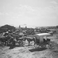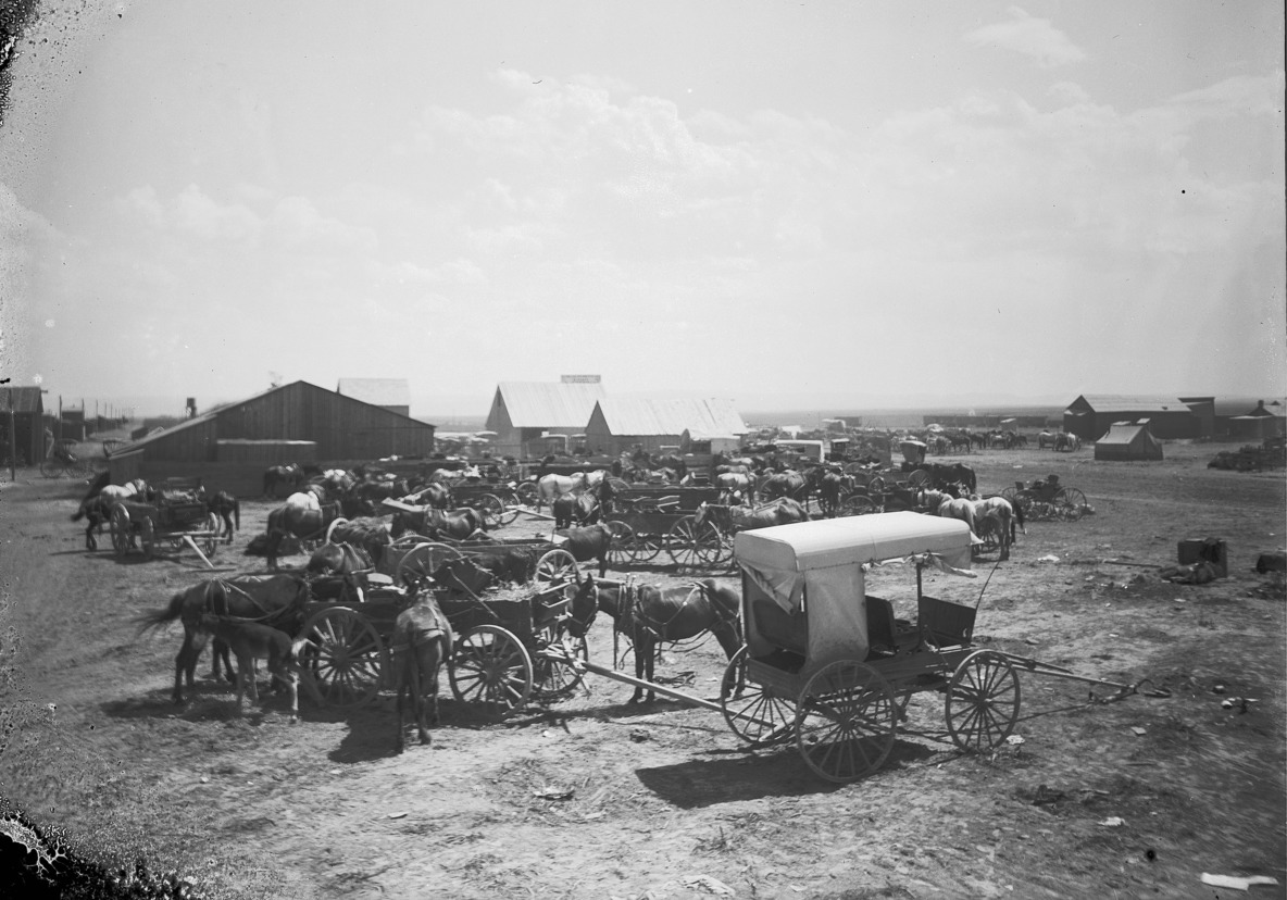 - A large number of teams, horses, buggies, and wagons spread among frame buildings.