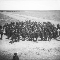 - A large group of men standing in a field; horses and/or cattle and a townsite in the distance.