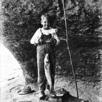 - A boy stands in front of a canyon wall with a stick fishing pole and showing off a caught fish.