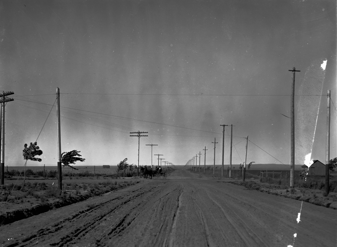 - A wide, windy thoroughfare lined by phone lines and newly planted trees; a buggy with passengers turning onto a side road. May be Blue Lakes Blvd.