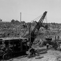 - Construction crews and a mobile crane, moving large boxes of rock in a canal bed.