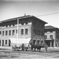 - Ezra Meeker, his ox-team, and wagon in front of the Hotel Perrine.