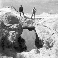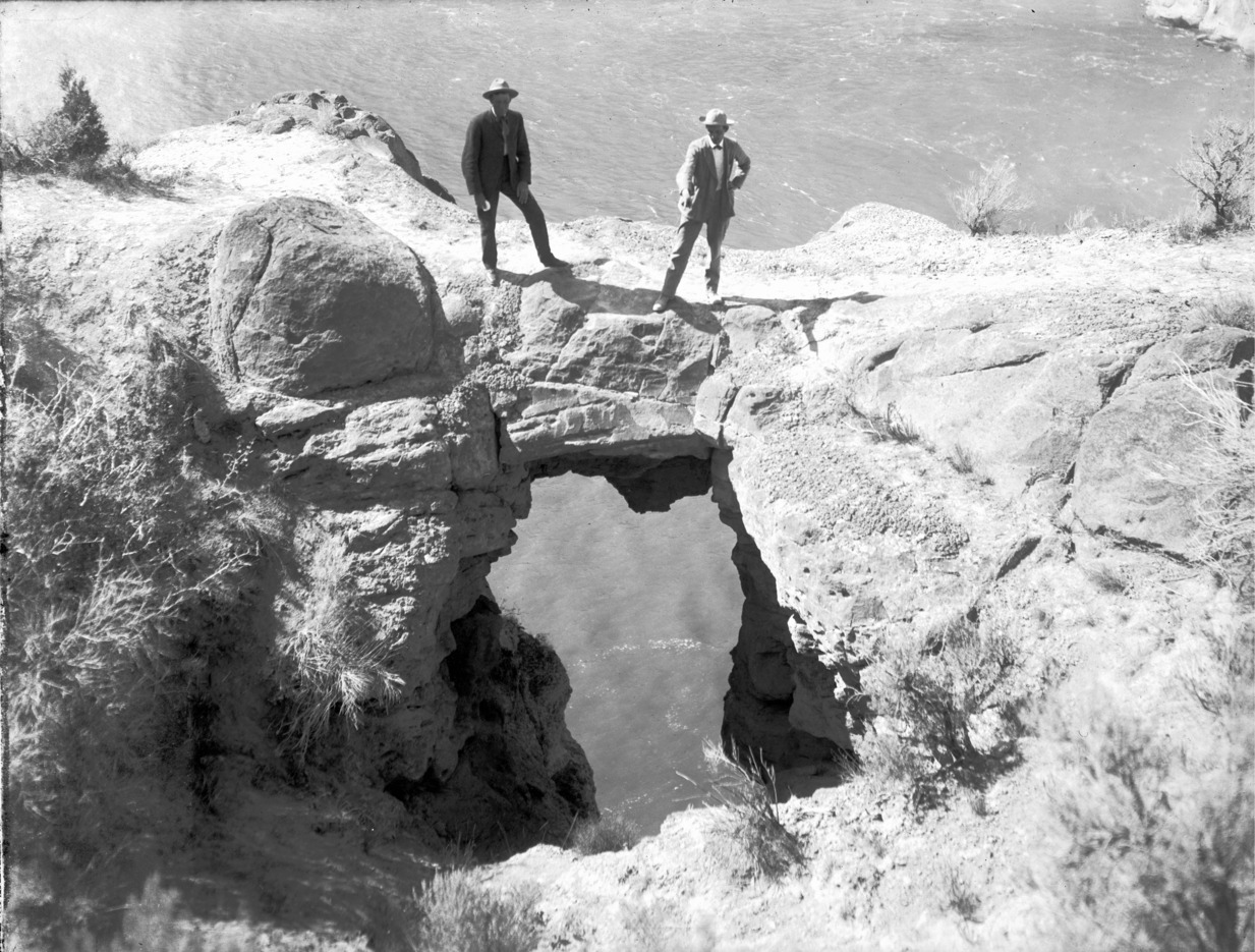 - Two men stand on a natural stone bridge (arch) at Shoshone Falls.
