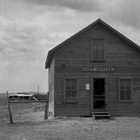 - A frame building identified as Post Office; a rough-hewn hitching post stands at left, and a low-slung barn or other outbuilding in the background. Possibly at Rock Creek (one of the signs reads "Rock Creek, July 4").