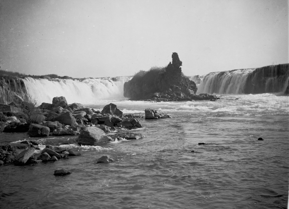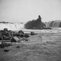 - Wide view of Upper Salmon Falls from creek level; rock formation in middle