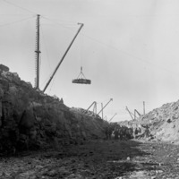 - A crew of men stand at the bottom of a canal channel. Several construction derricks can be seen along the rims.