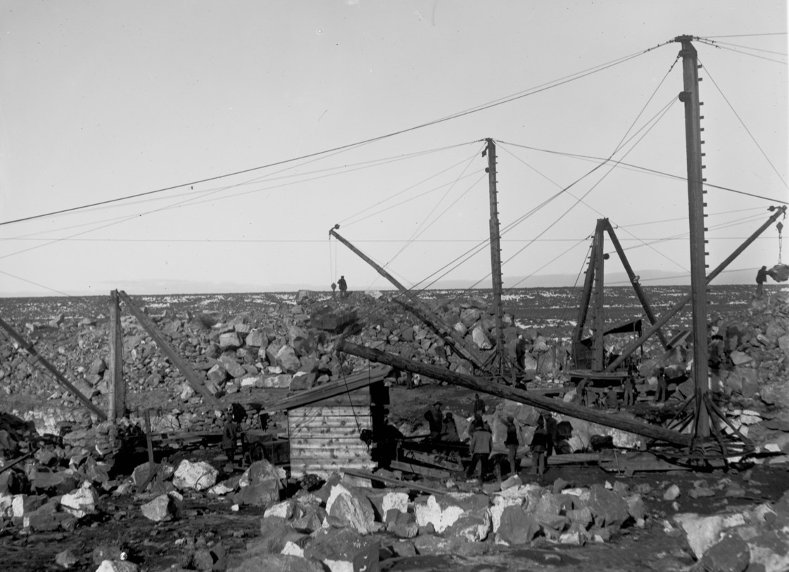 - Construction crews and derricks moving rock in a canal bed.