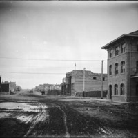 - View of Main Ave, looking southeast; Hotel Perrine in the foreground. Construction underway along street.