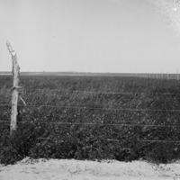 - View of a field beyond a wire fence.