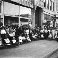 Women and children, including many babies in carriages pose in front of the Idaho Department Store building. Other businesses visible are the Booth Mercantile Co., Falls Steam Laundry, Bedford Drug Co., and G.F. Baker, Dentist. The reflection of the Rogerson Hotel can be seen in the window.