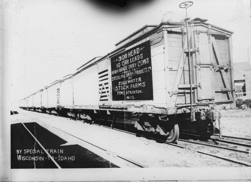 - "By special train, Wisconsin to to Idaho; " A train car with a sign that reads, " 300 head, 10 car loads; High Grade Dairy Cows Sold to Sterling Dairy Products Co. by Edgewater Stock Farms; Fort Atkinson, Wisconsin."