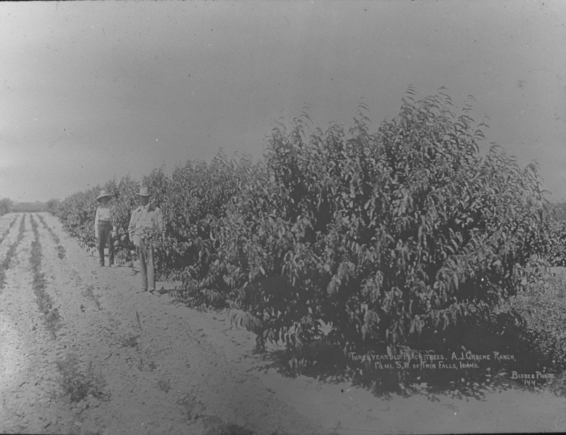 - "Three year old peach trees. A.J. Greene Ranch, 1 1/2 Miles Southwest of Twin Falls, Idaho;" two men stand beside a row of peach trees.