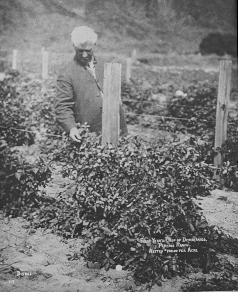 - "First Year's Crop of Dewberries. Perrine Ranch. Netted $700.00 Per Acre;" man standing in a berry patch.