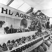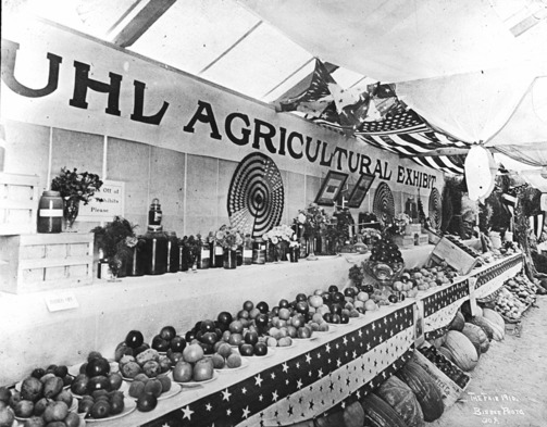- "The Fair 1910;" Buhl Agricultural exhibit inside tent with fruits, vegetables, preserves, and flowers