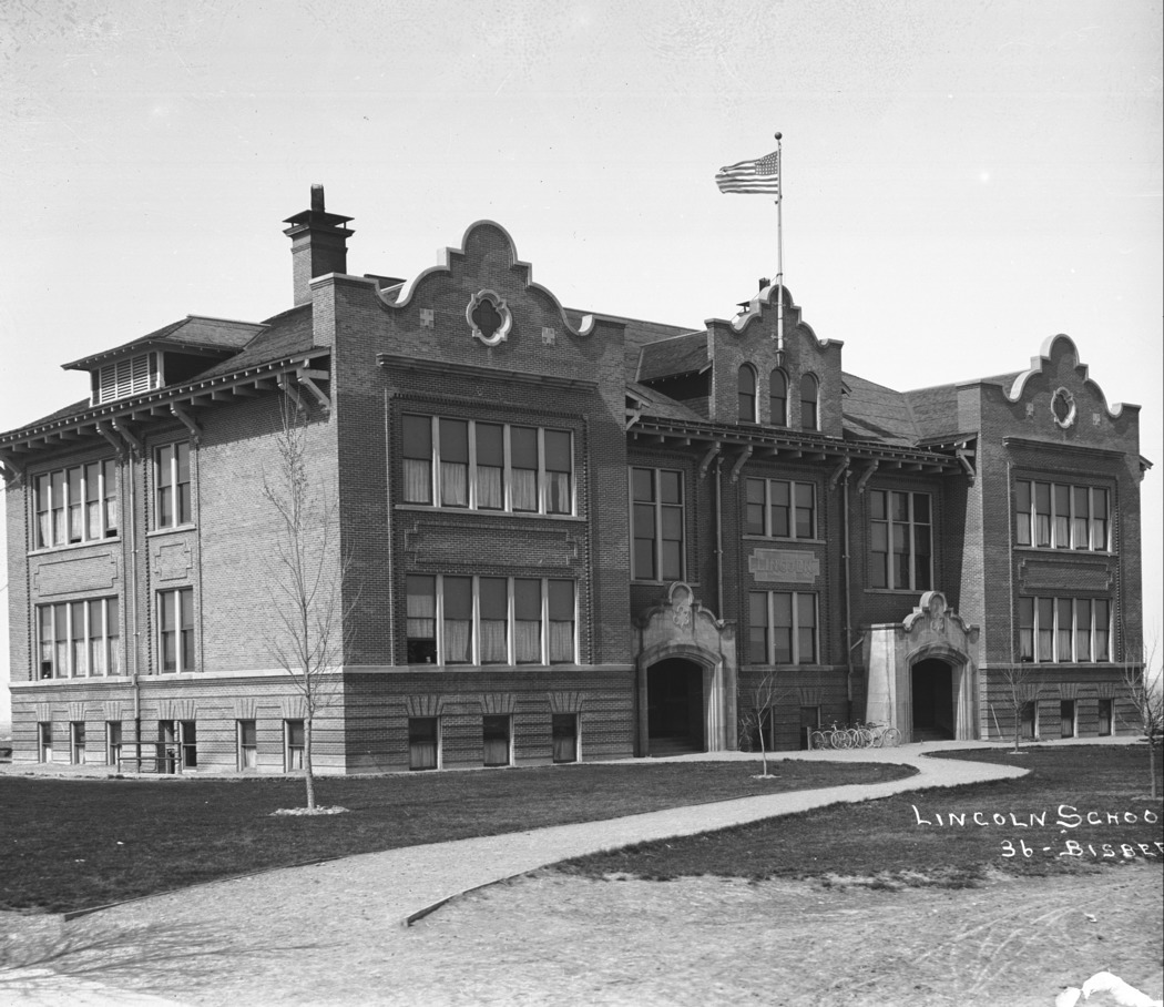 - "Lincoln School;" with landscaping, soon after construction. {This building was demolished in 1975.}