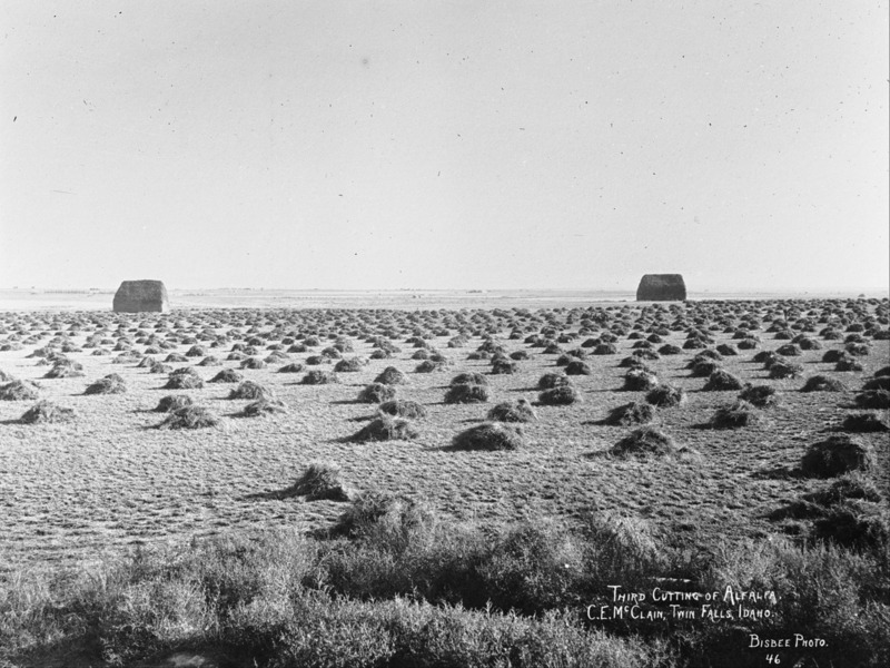 - "Third Cutting of Alfalfa. C.E. McClain, Twin Falls, Idaho;" field with small piles of alfalfa. Two large stacks of hay/alfalfa in the background.
