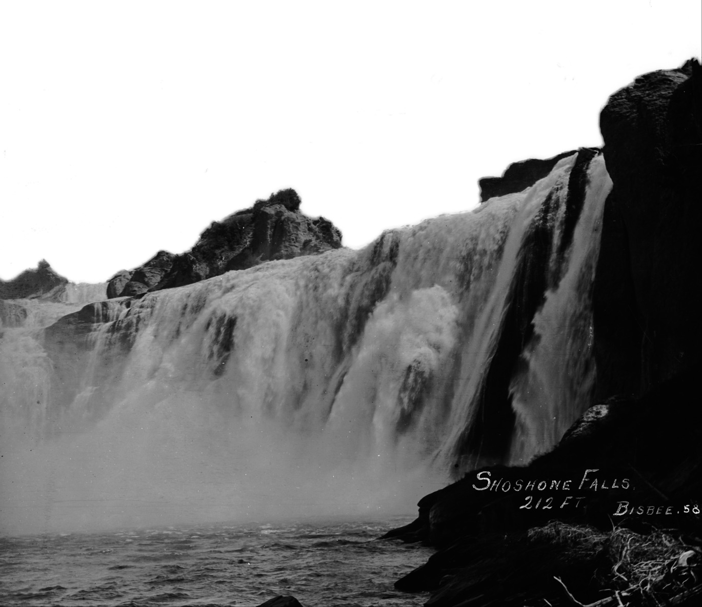 - "Shoshone Falls; 212 ft;" a view from the river below the falls