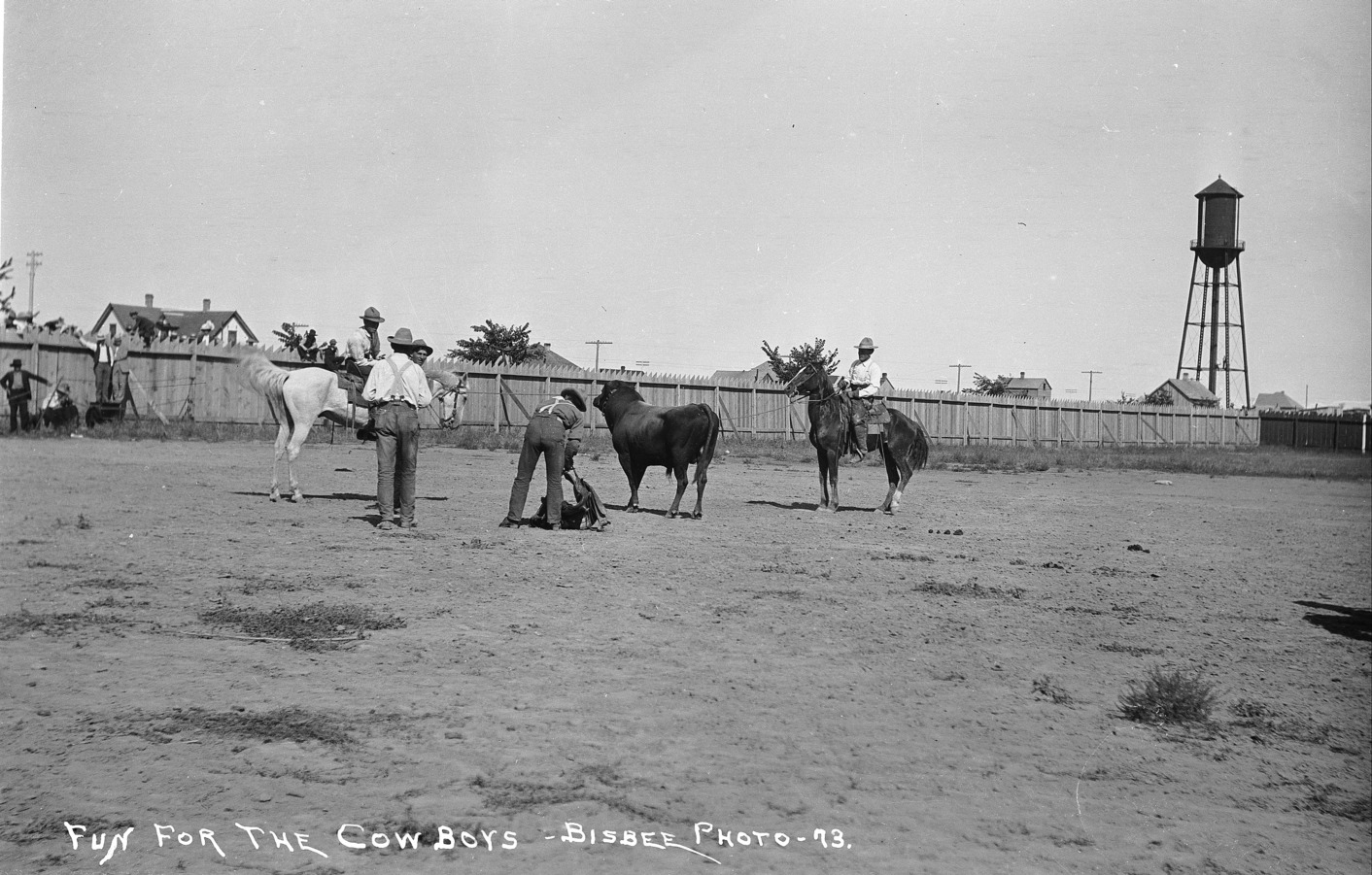 "Fun for the Cowboys;" cowboys exhibiting horse at the Twin Falls Athletic Field; two men on horseback, one holds a rope tied to a bull, three others stand among them, one with a saddle. Several spectators stand beside or sit on the fence in the background. Water tower and several houses in background.