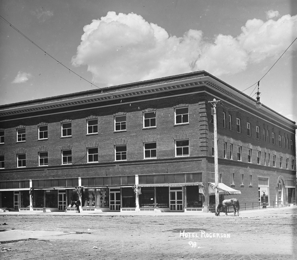- "Hotel Rogerson; " view of the hotel from the corner; the road is unpaved, and a horse stands at the corner.