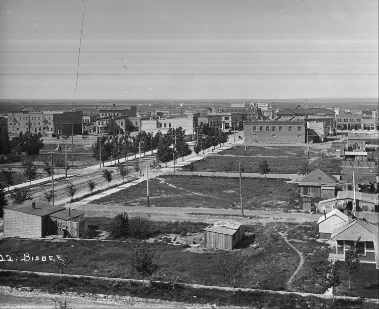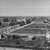 - Aerial view of early Twin Falls; looking south toward Shoshone St and Main Ave from the Twin Falls County Court House. Rogerson Hotel on left, Hotel Perrine on right.