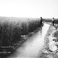 - "Irrigation;" two men stand beside a canal ditch.