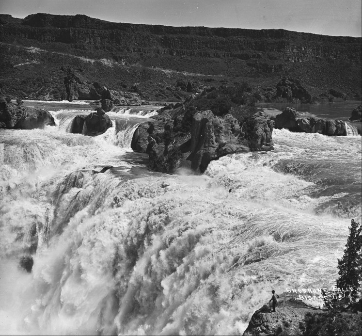 - "Shoshone Falls;" a man on the rocks in the foreground looks out over the Falls near full flow.