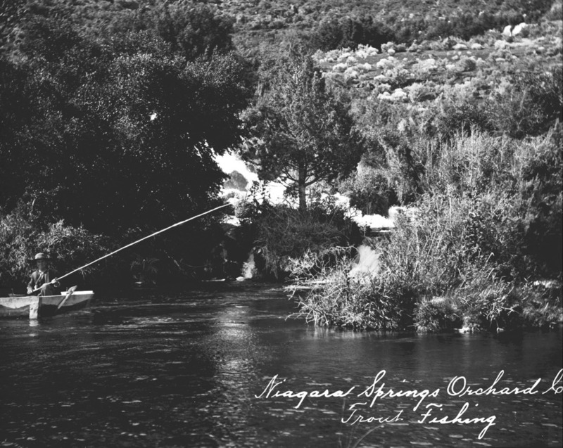 - "Niagara Springs Orchard Co, Trout Fishing;" a man fishes with a long pole from a boat