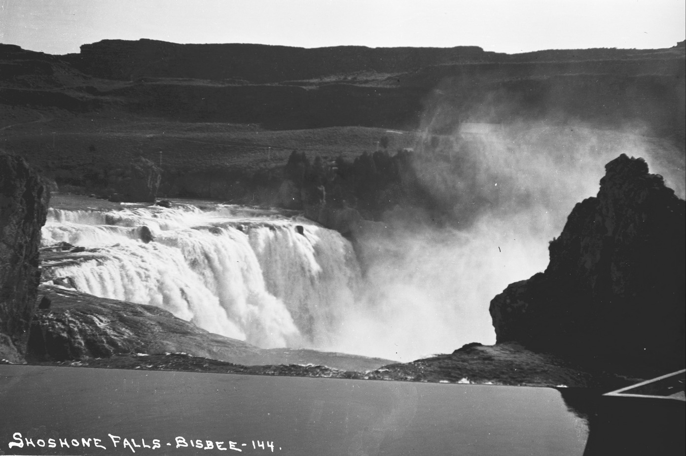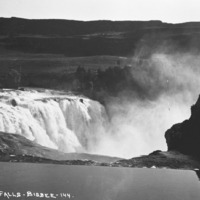 - "Shoshone Falls;" view across the Falls from the north side; the hotel is barely visible behind mist